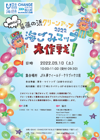 CHANGE FOR THE BLUE 千葉県実行委員会は、2022年9月10日(土)に「幕張の浜クリーンアップ2022海ごみマップ大作戦」を開催します。(協力:千葉工業大学亀田豊ゼミ・Aqua Dream Project・アパホテル&リゾート〈東京ベイ幕張〉・幕張ベイタウン商店街振興組合・幕張新都心ホテル協議会・幕張新都心まちづくり協議会) このイベントは、日本財団が推進する海洋ごみ対策プロジェクト「海と日本プロジェクト・CHANGE FOR THE BLUE」の一環で開催するものです。