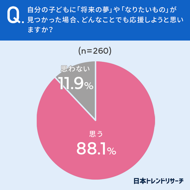 【高校生以下の子どもがいる男女260人に聞いた】88.1%が、子どもの将来の夢がどんなことでも「応援しようと思う」