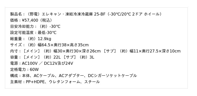 AC・DC電源対応で、最低温度-30℃設定まで可能なポータブル冷凍冷蔵庫「(野電)エレキャン 凍結冷凍冷蔵庫 25-BF」を、様々なアウトドアシーンやご家庭で、ぜひともご活用ください。