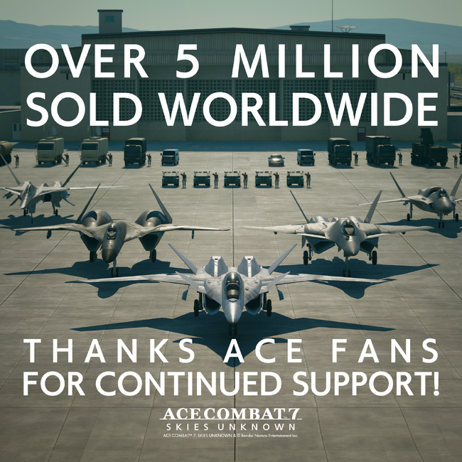 株式会社バンダイナムコエンターテインメントは、『ACE COMBAT(TM) 7: SKIES UNKNOWN』が世界累計販売本数(ダウンロード版含む)が500 万本に到達し、これにより『ACE COMBAT』シリーズの世界累計販売本数が 1,900 万本を突破したことをお知らせいたします。(※)