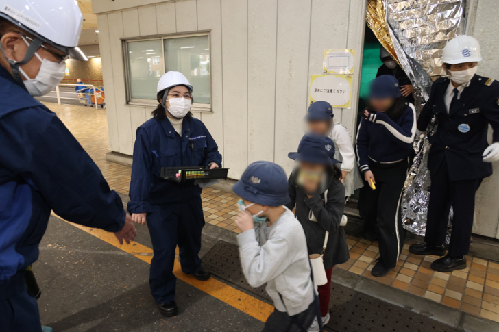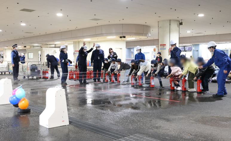 サンシャインシティでは、従前より毎年春と秋に豊島区と豊島消防署協力のもと、施設内のオフィス・商業テナントなどの在勤者約1,000名が参加する自衛消防訓練を実施しております。今回、在勤者向けの訓練終了後のバスターミナルにて、児童が学校で学んだ「防災」についてより理解するために、授業の一環として防災について考えるきっかけづくりを目指したサンシャインシティ独自の「なんか面白い、防災体験!」*を体験しました。