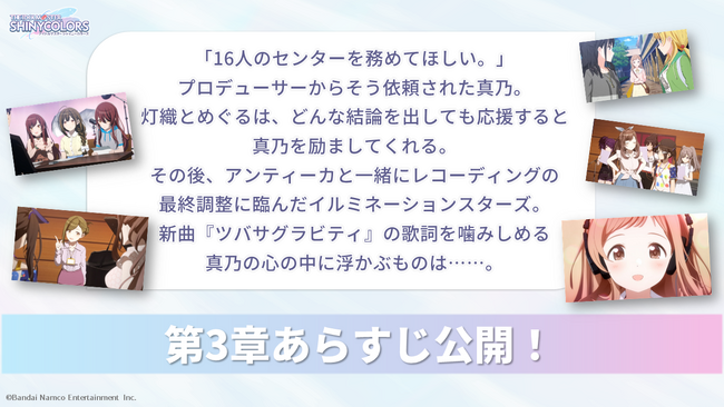 株式会社バンダイナムコエンターテインメントは、1月5日(金)より全国の映画館で上映予定のアニメ「アイドルマスター シャイニーカラーズ」(以下、シャニアニ)第3章のあらすじを公開したことをお知らせいたします。