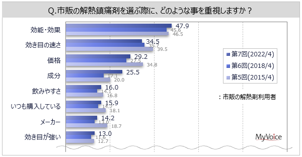 【解熱鎮痛剤に関する調査】直近1年間に市販の解熱鎮痛剤を利用した人は約45%、女性で比率高い。選定時に「成分」を重視する人が2018年調査と比べて増加