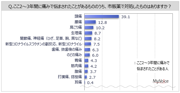 ここ2〜3年間に痛みで悩まされたことがある人が、市販薬で対処したものは(複数回答)、「頭痛」が39.1%、「腰痛」が12.8%、「肩こり痛」が10.2%です。男性30代や女性10〜50代では「頭痛」が各50%台と高くなっています。女性10〜30代では「生理痛」が5割前後みられます。