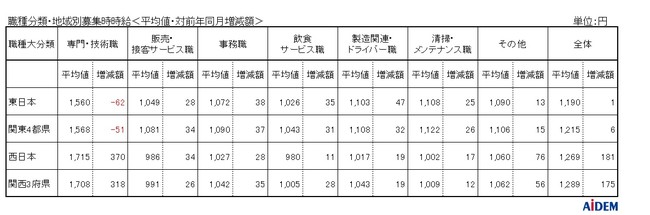 職種大分類別の平均時給は、「専門・技術職」1,715円(前年同月比370円増)、「事務職」1,027円(同28円増)、「製造関連・ドライバー職」1,017円(同19円増)、「清掃・メンテナンス職」1,002円(同17円増)、「販売・接客サービス職」986円(同34円増)、「飲食サービス職」980円(同11円増)の順で、前年同月比で全ての職種がプラスとなった。