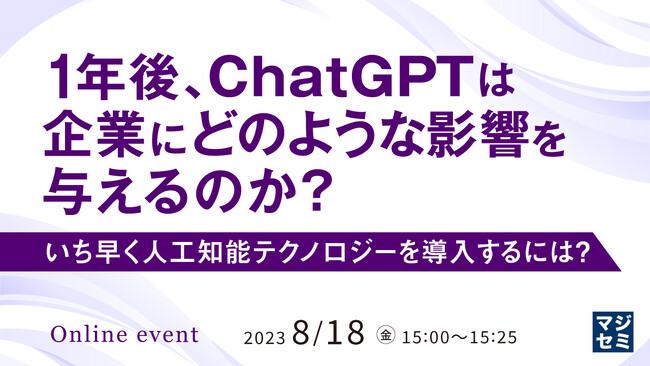 マジセミ株式会社は「1年後、ChatGPTは企業にどのような影響を与えるのか? いち早く人工知能テクノロジーを導入するには?」というテーマのウェビナーを開催します。