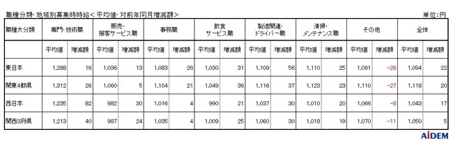職種大分類別の平均時給は、「専門・技術職」1,288円(前年同月比16円増)、「清掃・メンテナンス職」1,110円(同25円増)、「製造関連・ドライバー職」1,109円(同56円増)、「事務職」1,083円(同26円増)、「販売・接客サービス職」1,036円(同13円増)、「飲食サービス職」1,030円(同31円増)の順で、前年同月比で全ての職種がプラスとなった。