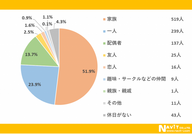 「誰と休日を過ごすことが最も多いですか?」という質問については、「家族」が51.9%、「一人」が23.9%、「配偶者」が13.7%という順になりました。