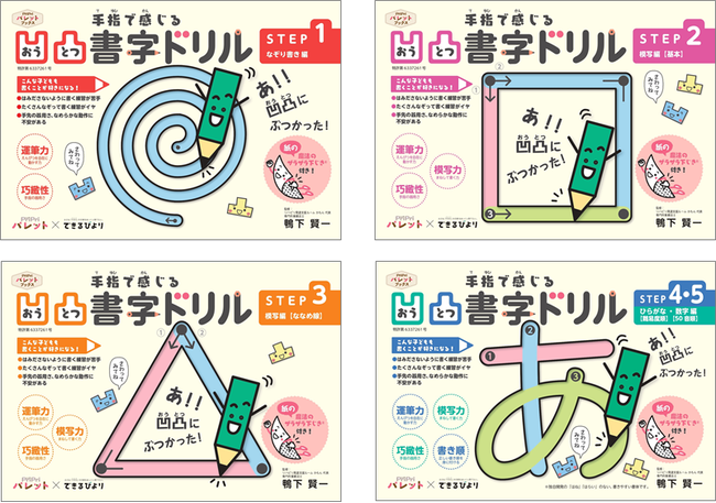 「筆圧が弱くて濃く書けない」、「鉛筆がすべって雑な字になってしまう」など、文字を書くのが苦手、嫌いという子は少なくありません。凹凸書字ドリルは、そんな子どもたちに向けた、今までにない新しいタイプの書字学習ドリルです。凹凸のある特殊な印刷を使い、図形やひらがなのフチをぼこっと盛り上げ、鉛筆の先がぶつかるように加工。盛り上がりの枠内で鉛筆を動かすことで、鉛筆を思うように動かす力「運筆力」と、手指の器用さ「巧緻性(こうちせい)」を養います。このドリルの目標は、ひらがな 50音がしっかり書けるようになること。専門作業療法士監修のもと、手指や手首の発達に合わせ、線→図形→文字と徐々にステップアップ! 「STEP1なぞり書き編」「STEP2模写編【基本】」「STEP3模写編【ななめ線】」「STEP4・5 ひらがな・数字編」と段階に分けた、全4冊です。