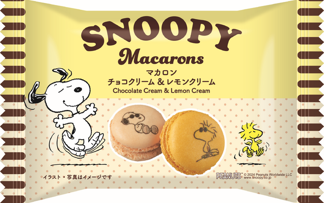 【内容】スヌーピーとウッドストックがプリントされた、チョコ味とレモン味のクリームを使用したマカロンです。(パッケージ2種)