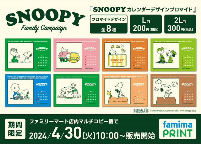 期間中、店内マルチコピー機サービス「ファミマプリント」にて、『PEANUTS』のファミマ限定ビジュアルを使ったカレンダーデザインブロマイドを発売いたします。