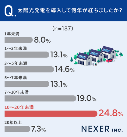 合計で32.1%の方が、太陽光発電を導入して「10年以上」が経過した、と回答しています。