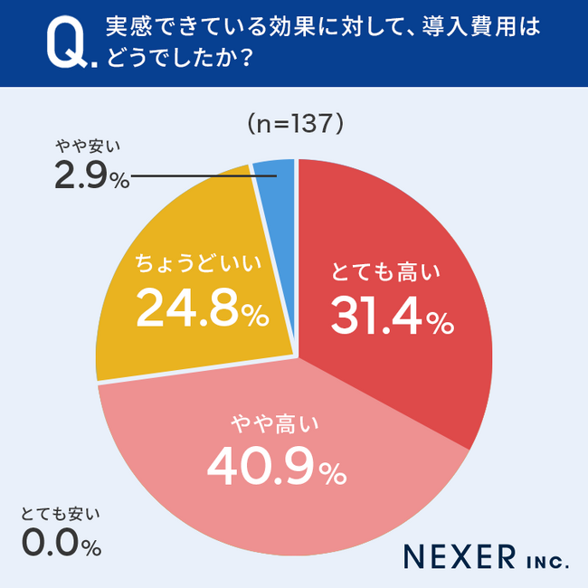 一方で実感できている効果に対して、7割以上の方が「費用導入が高く感じた」と回答しています。