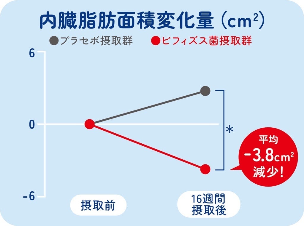 プラセボ摂取群と比較して腹部総脂肪面積・内臓脂肪面積の減少が見られました。