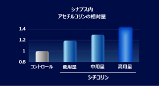 シチコリンの代謝動態及び作用に関わる受容体等の情報をキリン取得のデータや文献調査をもとに収集し、DX技術を活用してシチコリンの機能性を評価するためのQSPモデルを構築しました。構築したモデルを用いたシミュレーションにより、シチコリンの経口摂取が腸-神経コリン作動性シグナルを高めること(図1)、腸におけるシナプス(神経細胞同士が情報をやり取りする接合部)内のアセチルコリン(神経伝達物質)量が用量依存的に増加すること(図2)が予測されました。併せて、腸管上皮細胞と神経細胞の共培養系においてシチコリンの腸を介した神経活性化を実試験においても確認しました(図3)。