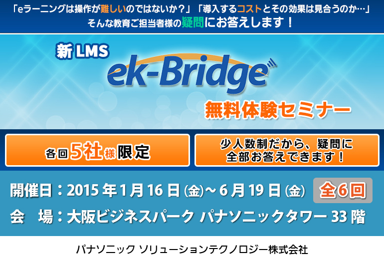 パナソニック ソリューションテクノロジー株式会社は、2015年2月20日(金)、3月20日(金)、4月17日(金)、5月15日(金)、6月19日(金)、大阪にて「新LMS『ek-Bridge』無料体験セミナー」を開催します。
