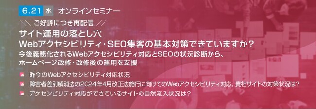 トランスコスモス株式会社(代表取締役共同社長:牟田正明、神谷健志)は、オンラインセミナーご好評につき再配信 サイト運用の落とし穴、Webアクセシビリティ・SEO集客の基本対策できていますか?を6月21日(水)に開催します。