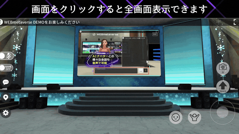 本機能は、WEBmetaverseの利用者から特に高い要望として寄せられていたもので、イベント主催者が参加者に向けて、使用中の端末画面をリアルタイムで簡単に共有できるようになります。さらに、他の機能同様、本機能を利用する際にユーザー登録を行う必要はなく、Webブラウザのみで利用が完結します。