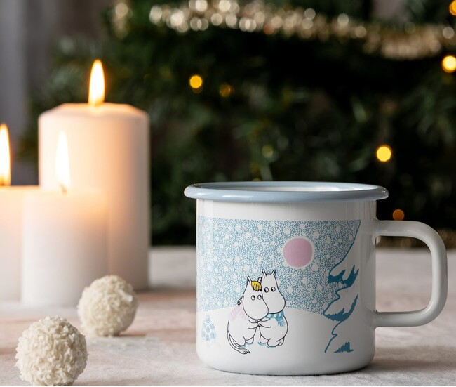 ムーミンカウッパ限定柄のマグカップです。雪が舞う中でムーミントロールとスノークのおじょうさんが寄り添うロマンチックな新シリーズ。