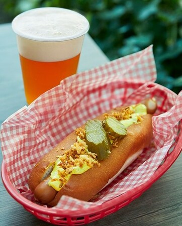 ホットドッグは、デンマーク産ポークのソーセージに、マヨネーズとヨーグルト、スパイスを使った爽やかなレミレーソースをかけて、フライドオニオンをトッピング。日替りで楽しめるデンマークのクラフトビールと一緒にどうぞ。