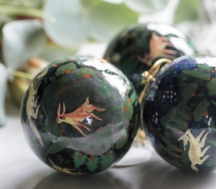 繊細な筆使いで描かれたオーナメントはフェアトレードで作られたもの。