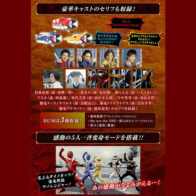 本体のセリフボタンを押すことで、劇中のセリフを聞いたり、感動の5人一斉変身モードを楽しむことができます。本体にはOP曲「爆竜戦隊アバレンジャー」他、BGMを全3曲収録予定。