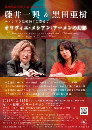 現代音楽アンサンブル・東京現音計画のメンバーが自由に企画するアラカルトシリーズ第8弾は、ピアニストの黒田亜樹によるクリスマス企画。メシアンの愛弟子である藤井一興と、藤井の薫陶を受けた黒田による師弟共演にて、メシアンのピアノデュオ作品の傑作をお届けします。
