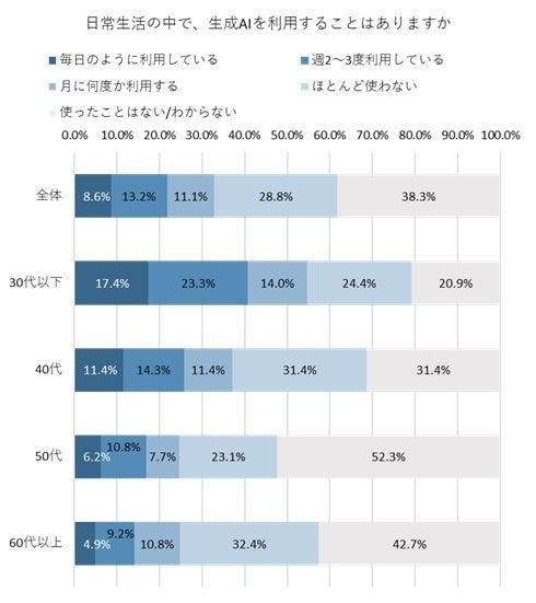 年代別にみると、年代が上がるにつれて、「毎日のように利用している」と回答した割合は低くなった。 また、「30代以下」では「毎日のように利用している」「週2〜3度利用している」「月に何度か利用する」と回答した割合が他の年代よりも高く、日常の中でより多く生成AIに触れていることがわかった。