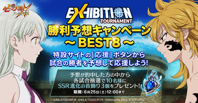 ネットマーブルは、 スマートフォン向けシネマティックアドベンチャーRPG『七つの大罪 〜光と闇の交戦(ひかりとやみのグランドクロス)〜』(略称:グラクロ)において、初となる公式PvPイベント「エキシビショントーナメント」のBEST8とBEST4の模様を、明日6月25日(土)12:00よりYouTubeにて生配信することをお知らせいたします。