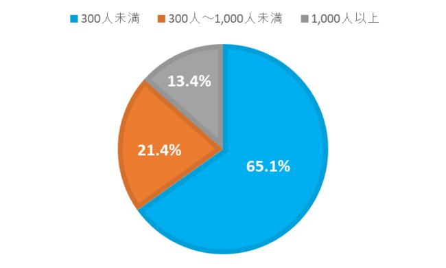 企業規模別の掲載社数割合は、「300人未満」が全体の65.1%、「300人~1,000人未満」が21.4%、「1,000人以上」が13.4%【図2】