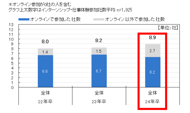 インターンシップ・仕事体験の平均参加社数は8.9社。そのうち対面で参加した社数は2.7社で前年より増加【図3、4】