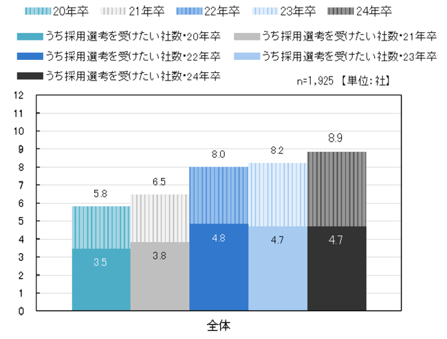 インターンシップ・仕事体験に参加した社数の平均は8.9社(前年比0.7pt増)で、そのうちオンラインは平均6.2社(前年比0.5pt減)だった。対面(オンライン以外)での参加は平均2.7社(前年比1.2pt増)で前年より増加した。また、参加した8.9社のうち採用選考を受けたい社数の平均は4.7社で前年と変わらず、学生は参加した中からある程度絞り込んで採用選考を受けるようだ。【図3、4】