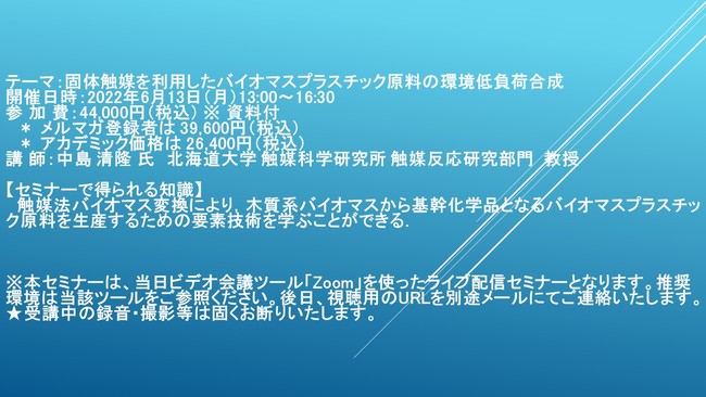 【ライブ配信セミナー】固体触媒を利用したバイオマスプラスチック原料の環境低負荷合成 6月13日(月)開催 主催:(株)シーエムシー・リサーチ