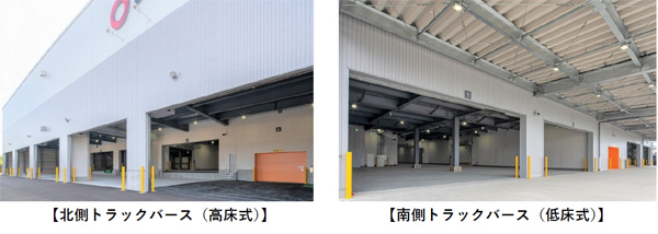 本センターは、建物の2面にトラックバース(※1)を設置しています。北側は高床式、南側は低床式のハイブリッドバースとなっていることから、さまざまな荷役方法に合わせてトラックバースを使い分けることができ、効率的な入出庫作業が可能です。
