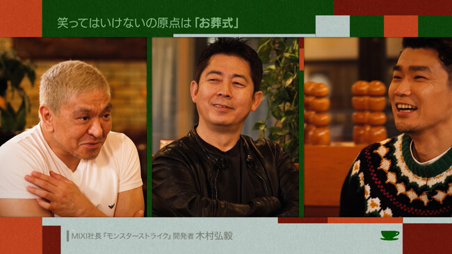 番組初ゲストとなったのは、大ヒットゲーム『モンスターストライク』を開発・リリースした株式会社MIXI代表取締役社長・木村弘毅さん。松本に影響を受けているという木村社長は、『笑ってはいけない』シリーズについて「発明品だ」と熱弁します。笑いとゲームの共通点を挙げつつ、そう考える理由を述べると、松本は「あれは僕もそう思いますよ。ひとつの発明だと思うし、もっと言えば、最初のころは……」と、初期と後期の違いを回顧。一方、高須は、『笑ってはいけない』を通して、視聴者を巻き込んだある企画を考えていたことを告白。その驚きの内容に「めちゃくちゃ面白い!」と反応が!