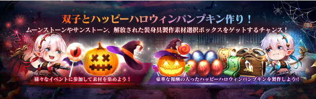イベント期間中は、ゲーム内の各種イベントで入手できる様々なアイテムを集めて「ハッピーハロウィンパンプキン」を作ることができます。ハッピーハロウィンパンプキンからは、ムーンストーンやサンストーン、解放された装身具製作素材選択ボックスなどのアイテムを獲得できます。