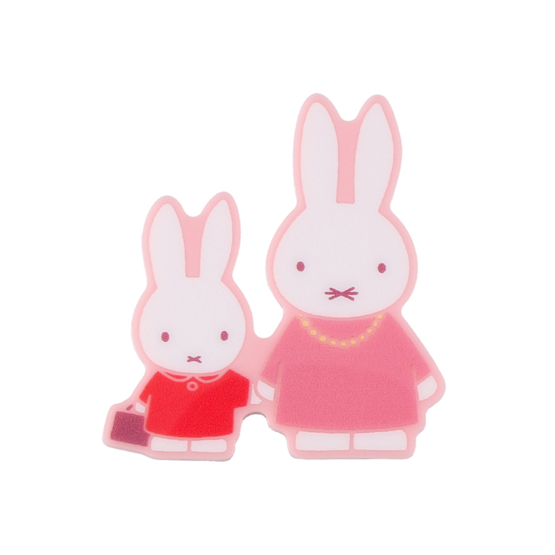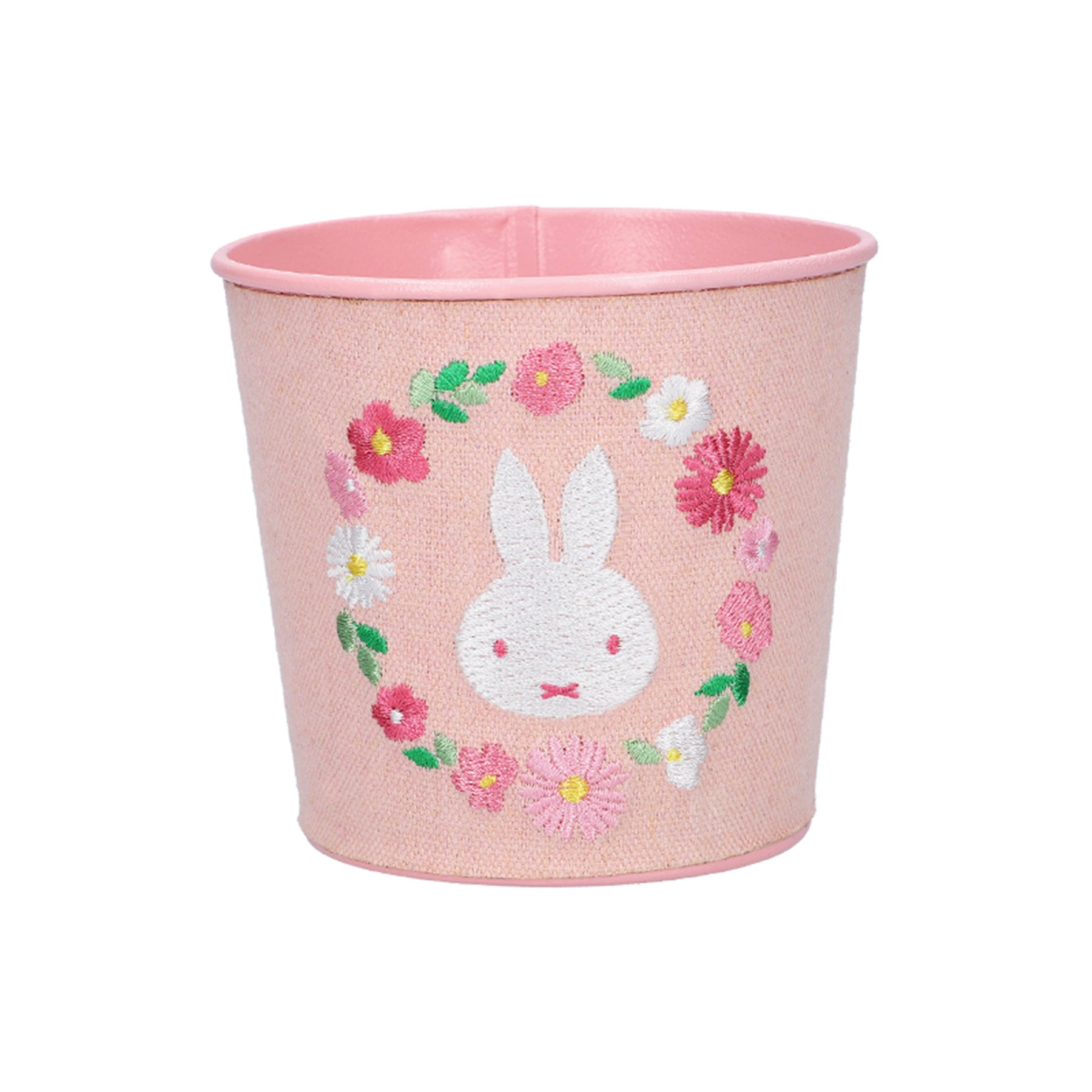 ピンクのプランターカバーと限定デザインのマグネットピック、アイアンスタンド、生花のカーネーションまたはアートフラワーとオリジナルメッセージカードのセットです。プランターカバーには、ディック・ブルーナさんの描いたお花をあしらったリースとミッフィーのお顔の刺しゅうを施し、華やかながらもあたたかみのあるデザインに仕上げました。ミッフィーとお母さんの限定デザインのピックは、マグネットになっていて、取り外してお家やデスク周りなどさまざまな場所に飾ることができます。