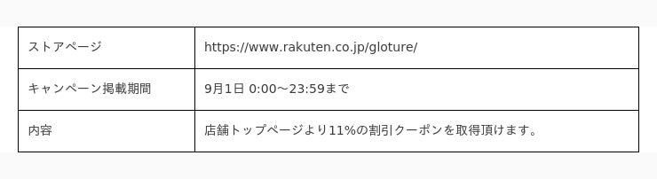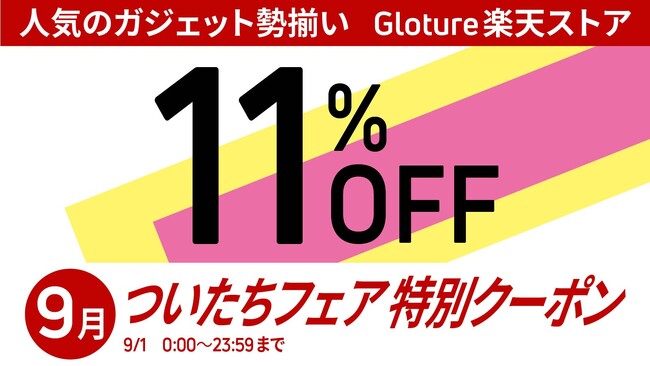 【期間限定】【大変オトクな11%OFFクーポン】Gloture楽天ストアで「楽天 ついたちフェア」で使えるクーポン配布【9月1日】