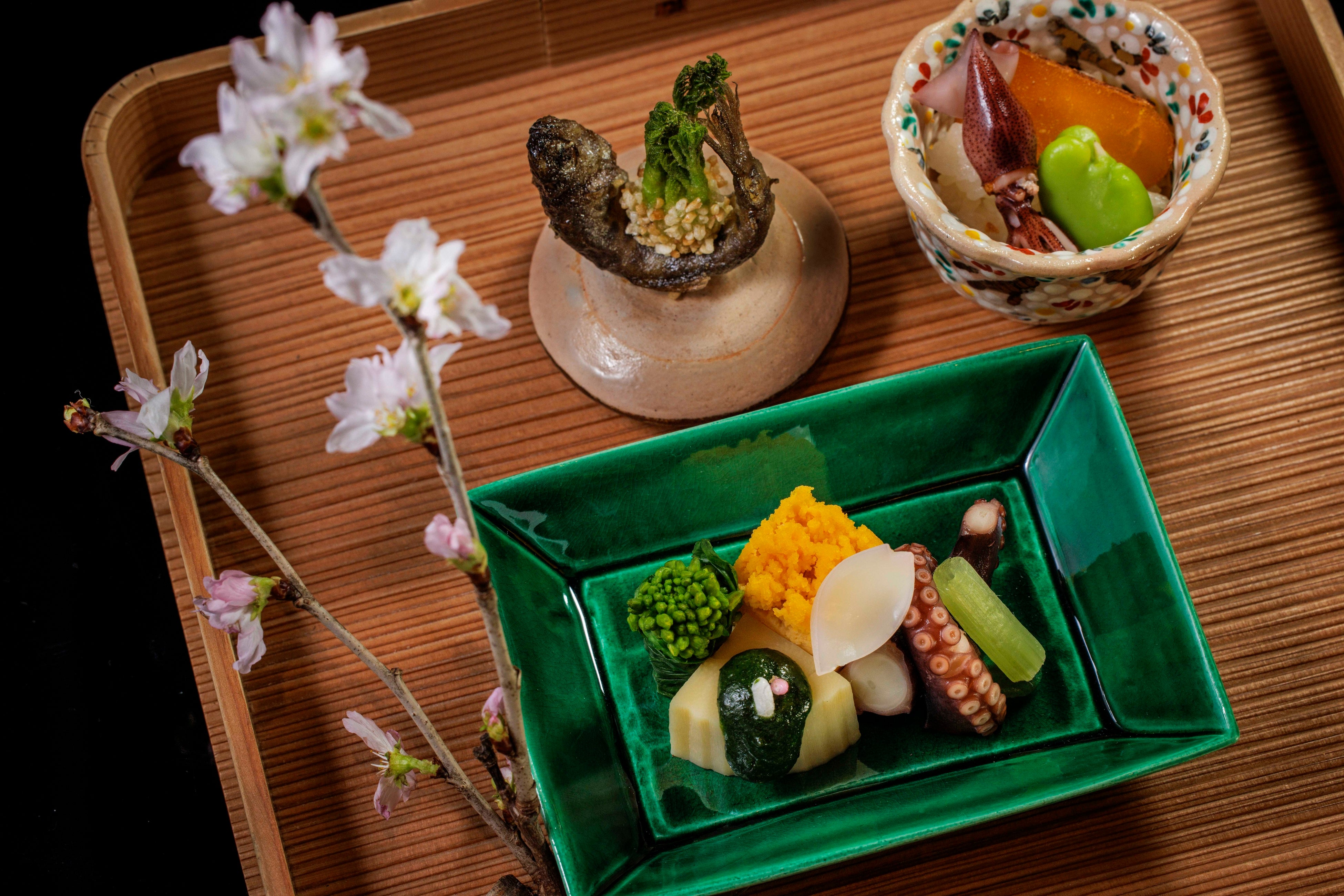 爽やかな木の芽の香りが際立つ「筍木の芽和え」や、玄米粉で香ばしく揚げた「タラの芽」など、芽吹きの山菜を盛り込みました。さらに、もち米に蛍烏賊の旨味と唐墨の塩味を重ねた「蛍烏賊と一寸豆飯蒸し」、ヤマメの南蛮や子蛸の桜煮を添え、春の訪れを祝う一品です。