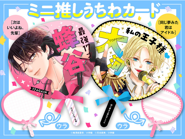その他に4号連続付録第2弾の「ミニ推しうちわカード」も付いてきます! 今号は、大人気連載『次はいいよね、先輩』(梅澤麻里奈)と『同じ夢みた君はアイドル』(花本麻実)の推しうちわで、裏面にはメッセージが書き込めます! 人気キャラがアイドル風に変身した、ここでしか手に入らない描き下ろしメッセージカード付録です。