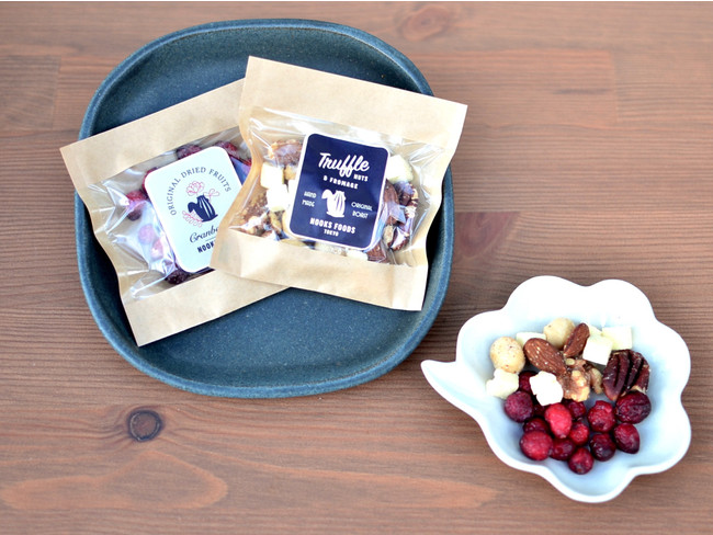 白と黒のイタリア産トリュフ塩、白トリュフオイルをからめて焼きあげたナッツ、サクサク食感のオーストラリア産ドライチェダーチーズをミックスした「トリュフナッツ&フロマージュ」と、東ヨーロッパ産のしっとり甘酸っぱい「プレミアムドライクランベリー」の2種を、食べきりサイズにして詰め合わせました。