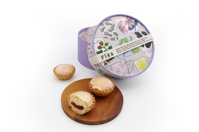 ミニタルトにダマンド生地、中心にラズベリージャムを入れ、表面にアイシングをした北欧定番のケーキ「マサリーン」。可愛い丸箱のパッケージは、北欧の有名なアパレルブランドでも活躍しているマイヤ・ロウエカリ氏のオリジナルデザインです。
