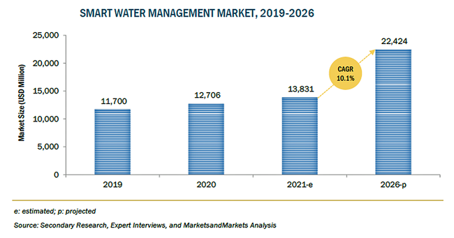 スマートウォーターマネジメントの市場規模は、2021年の138億米ドルからCAGR10.1%で成長し、2026年には224億米ドルに達すると予測されています。これは、水道事業者に対する高品質で継続的な水供給の要望、スマートなソリューションを実現するための先進技術の導入、持続可能な生活への関心の高まり、各国政府による水の消費量削減に向けた規制、水処理ソリューションの開発などに起因しています。
