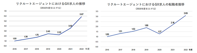 『リクルートエージェント』における「GX求人」(定義は最終ページに記載)の推移をみると、2016年度を1とすると2022年度では5.87倍だった。特に2020年度からの伸びが顕著であり、今後も求人は増加すると考えられるが、実際の転職者は3.09倍であり求人の増加に対して伸び幅が小さいのが現状だ。