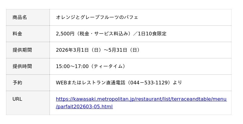 ホテルメトロポリタン 川崎(運営/日本ホテル株式会社、総支配人/金田 文典)の直営するオールデイダイニング「Terrace and Table」では、2026年3月1日(日)〜2026年5月31日(日)の期間、旬の柑橘の美味しさを存分に楽しめる新作「オレンジとグレープフルーツのパフェ」をティータイムに提供いたします。