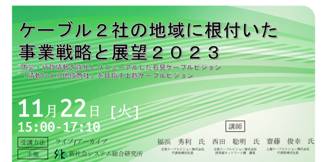 「ケーブル2社の事業戦略と展望2023」と題して石見ケーブルビジョン株式会社 福浜 秀利氏、西田 聡明氏、上越ケーブルビジョン株式会社 齋藤 俊幸氏のセミナーを2022年11月22日(火)に開催!!