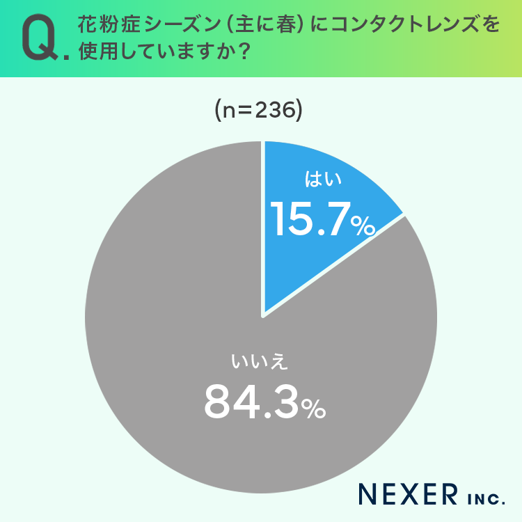 まず、花粉症がある方に花粉症シーズン(主に春)にコンタクトレンズを使用しているかどうかを調査しました。