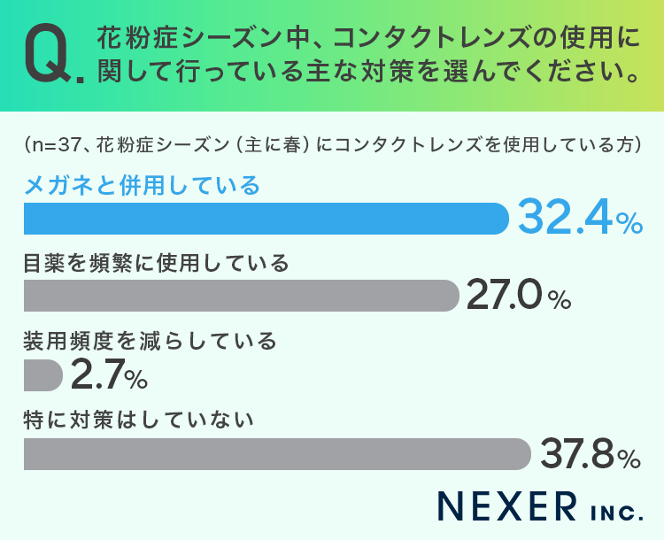 その結果「特に対策はしていない」が37.8%で最も多く、次いで「メガネと併用している」が32.4%、「目薬を頻繁に使用している」が27.0%となりました。