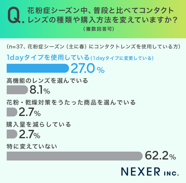 その結果「特に変えていない」が62.2%で過半数を占めました。一方で「1dayタイプを使用している(または1dayタイプに変更している)」が27.0%、「高機能のコンタクトレンズを選んでいる」が8.1%となりました。