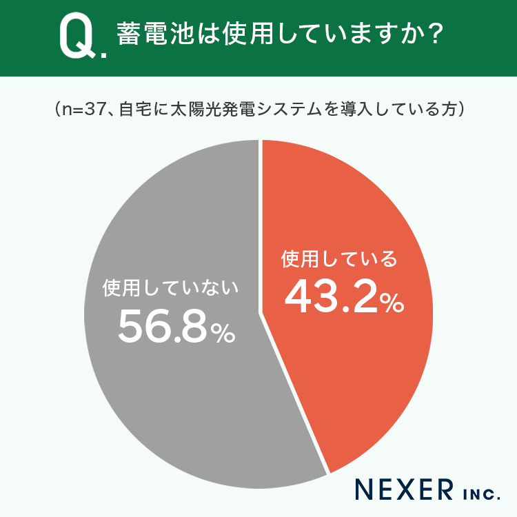 「使用している」が43.2%、「使用していない」が56.8%となり、太陽光発電システム導入者の半数以上が蓄電池を使用していないことがわかりました。